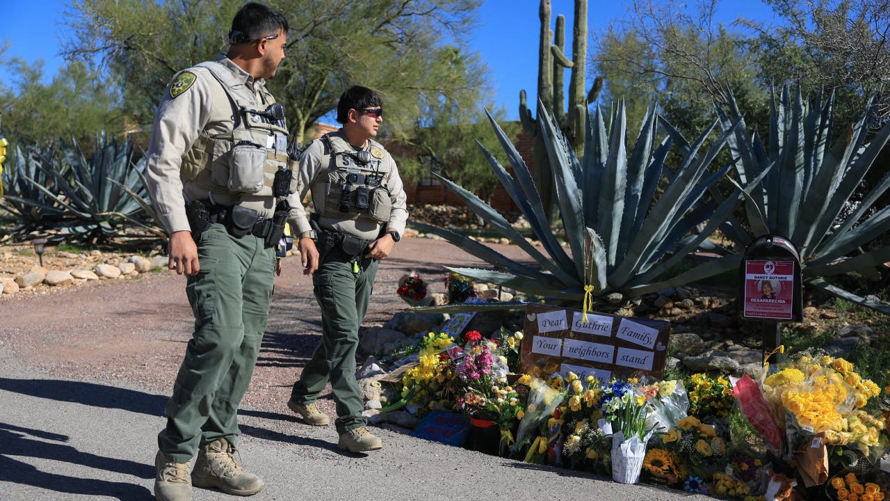 Pima County Sheriff's deputies walk past a memorial set up next to the driveway of Nancy Guthrie's home on February 22, 2026, in Tucson, Arizona. Law enforcement officials continue to search for Nancy Guthrie, the 84-year-old mother of U.S. journalis (Photo by Joe Raedle/Getty Images)