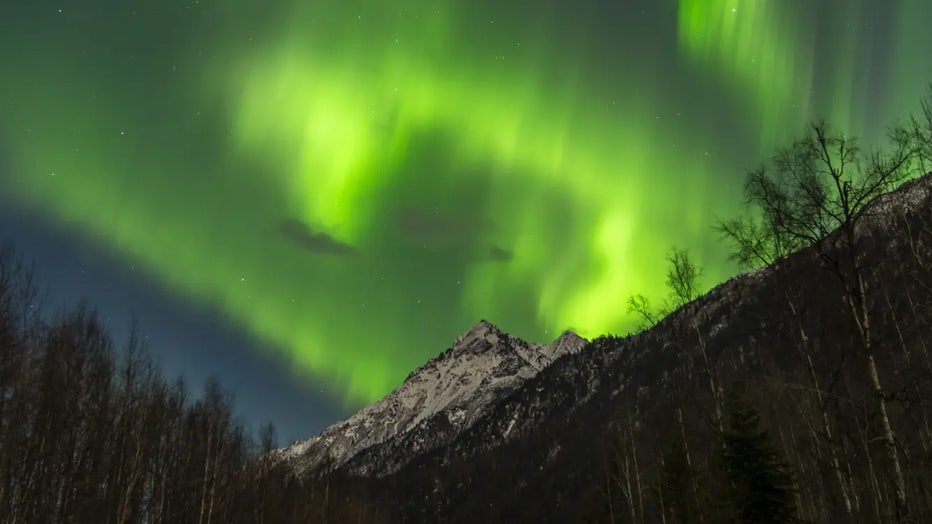 FILE: Northern lights (Aurora Borealis) illuminate the sky in Alaska's Eklutna Tailrace, United States on March 09, 2025. (Hasan Akbas / Anadolu / Getty Images)