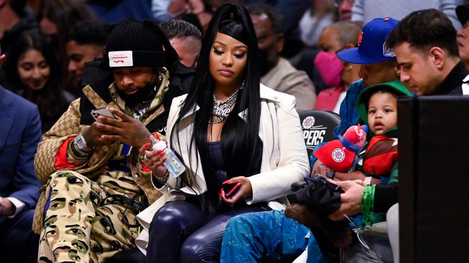Los Angeles, CA - February 03:Nicki Minaj with a bottle for her son at the Lakers vs Clippers game at Crypto.com Arena Thursday, February 3, 2022. (Photo by David Crane/MediaNews Group/Los Angeles Daily News via Getty Images)
