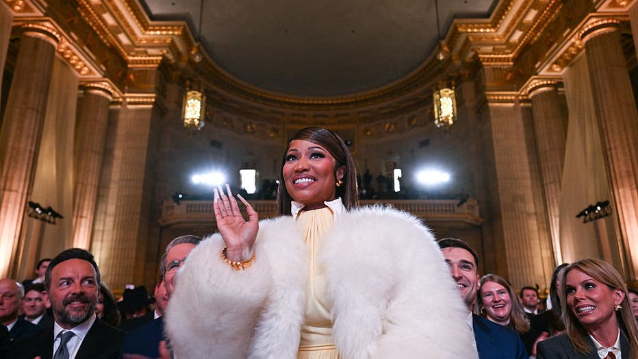 Trinidadian rapper and singer-songwriter Nicki Minaj reacts before US President Donald Trump speaks about 'Trump Accounts' at the Andrew W. Mellon Auditorium in Washington, DC, on January 28, 2026. (Photo by Brendan SMIALOWSKI / AFP via Getty Images)