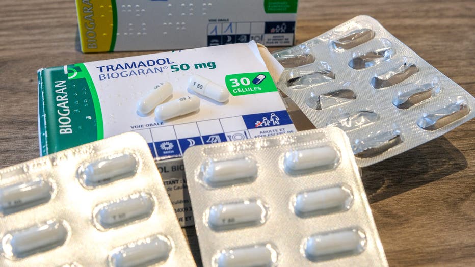 Illustration of three aluminum plates containing Tramadol capsules, placed on boxes of these drugs from the Biogaran laboratory, following the prescription of these analgesics on a prescription from a doctor to a patient in Valence in the south east