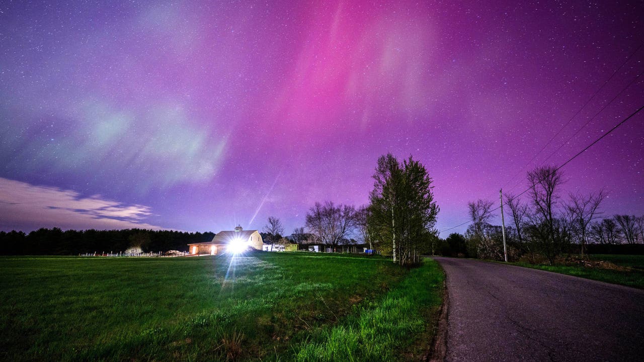 The aurora borealis fills the sky with pink and blue waves of color over a farmhouse in Mercer, Maine on May 11, 2024. (Credit: Michael Seamans/Getty Images)