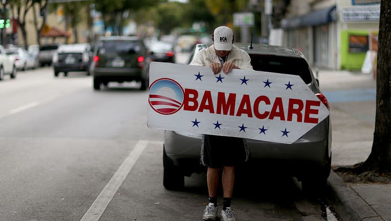 Pedro Rojas holds a sign directing people to an insurance company where they can sign up for the Affordable Care Act, also known as Obamacare. (Photo by Joe Raedle/Getty Images)