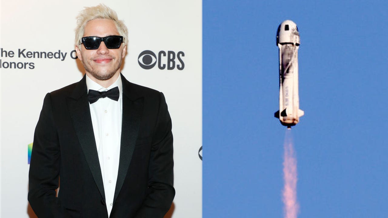 FILE IMAGES - (L) Pete Davidson attends the 44th Kennedy Center Honors at The Kennedy Center on Dec. 5, 2021, in Washington, DC. (Photo by Paul Morigi/Getty Images) (R) Blue Origin’s New Shepard flies toward space carrying Good Morning America co-anc
