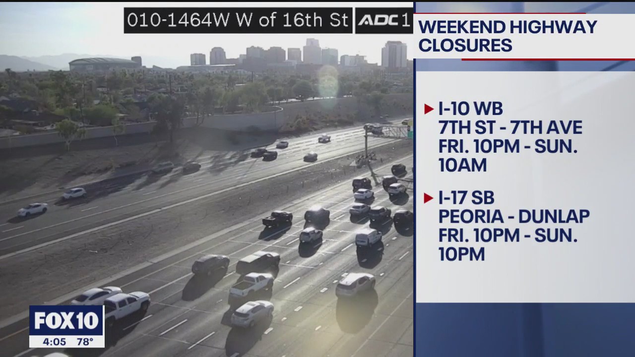 - Southbound I-17 between Peoria and Dunlap avenues from 10 p.m. Friday to 10 p.m. Sunday
