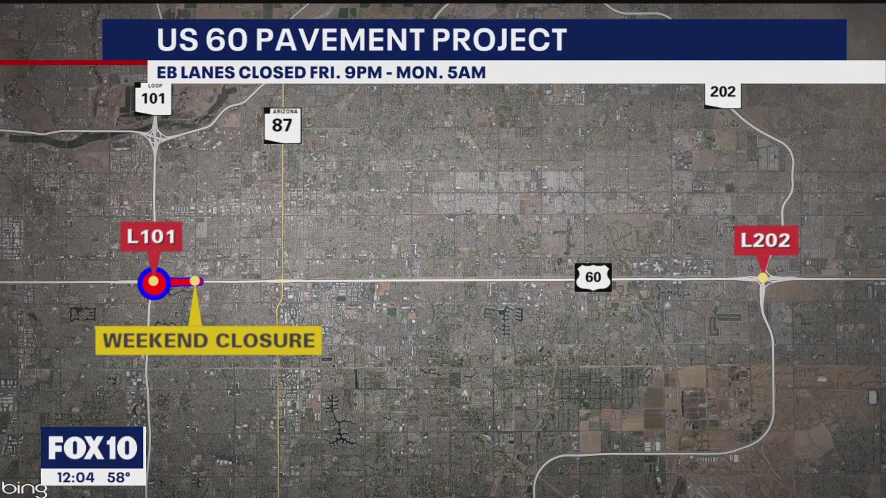 In Mesa, the eastbound lanes of US 60 will be closed between Loop 101 Price and Dobson Road starting at 9 p.m. Friday to 5 a.m. Monday.
