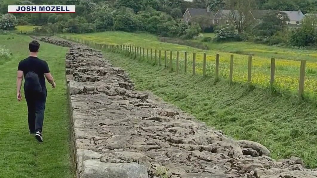 He is hiking the entirety of Hadrian's Wall along the English countryside, fighting the wind and rain along the way.