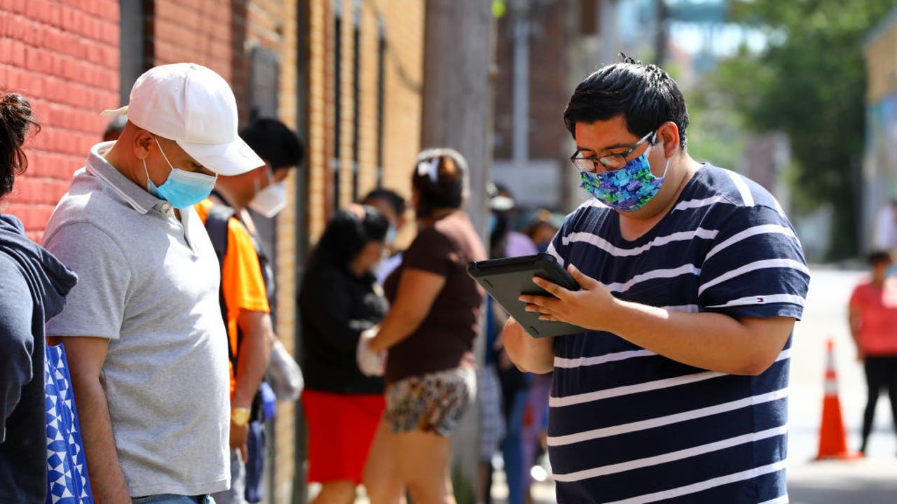 A file image dated June 4, 2020 shows a Census 2020 field organizer interviewing a resident in the food pantry line in Chelsea, Massachusetts. (Photo by Pat Greenhouse/The Boston Globe via Getty Images)