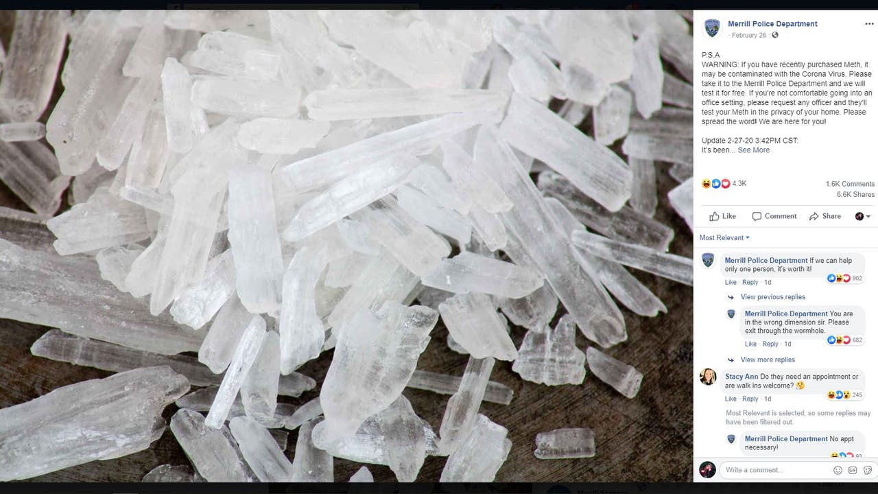 "WARNING: If you have recently purchased meth locally, it may be contaminated with the coronavirus," the post reads. "Please take it to the sheriff's office or police department and they will test it for free."