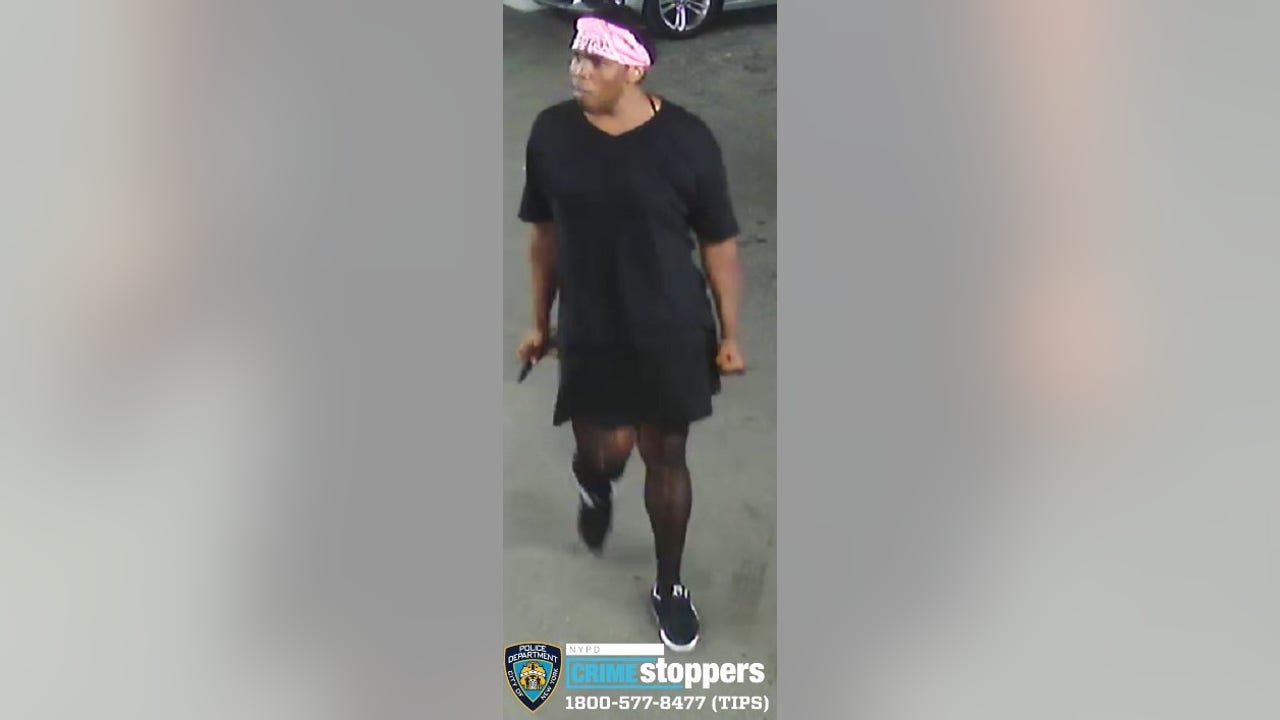 The suspect is described as 20-30 years old, 5'11" tall, 200 lbs. and was wearing a black dress, pink bandana, black stockings, and dark-colored sneakers.