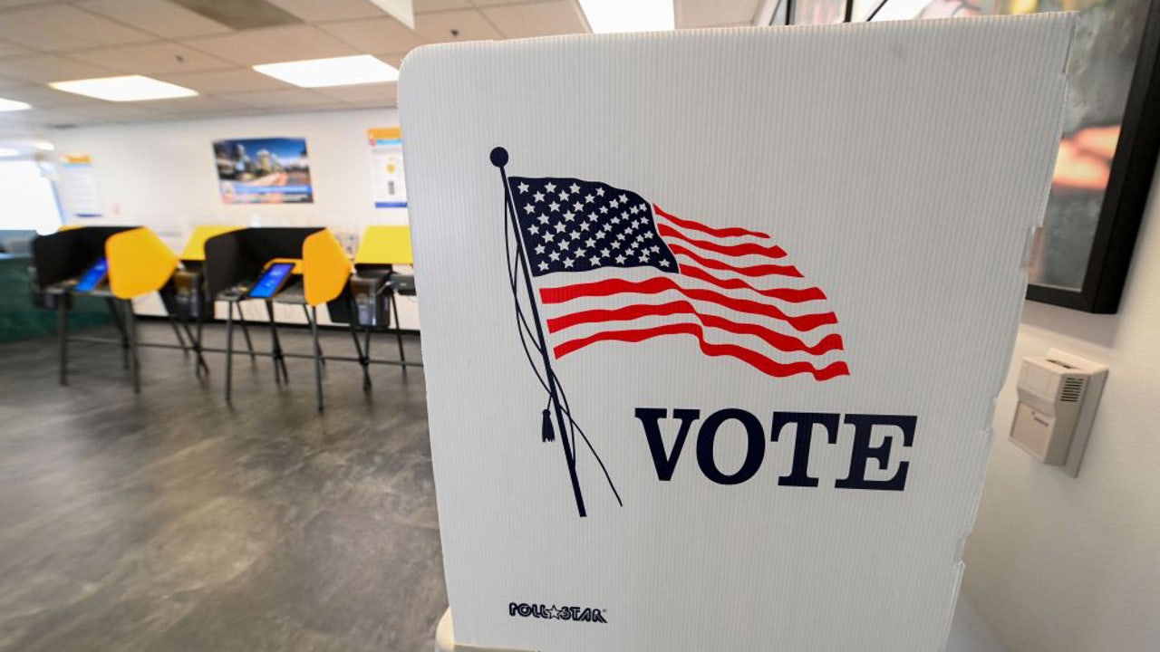 FILE-Voting machines are on display at the Los Angeles County Registrar-Recorder/County Clerk office, August 27, 2021 in Norwalk, California. (ROBYN BECK/AFP via Getty Images)