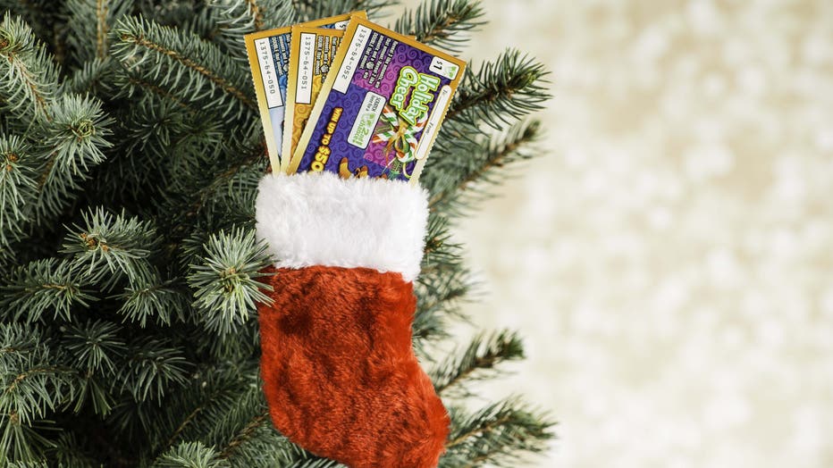 FILE - A horizontal studio shot of a blue spruce pine tree with a small felt stocking that is holding three lottery scratch tickets. Getty Images