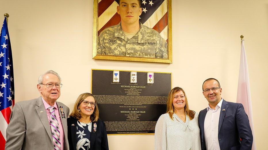 U.S Army Staff Sgt. Michael Harold Ollis’ parents, Robert and Linda Ollis, sister Kelly Manzolillo, and the Polish Army officer whose life he saved, Lt. Karol Cierpika, joined to unveil his portrait and memorial plaque tribute during a ceremony to re