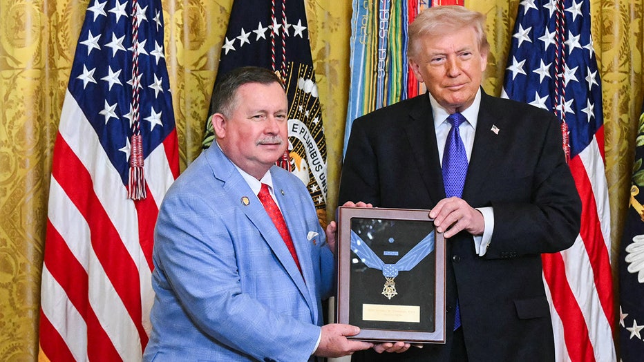 Chris Edmonds (L), son of Army Master Sgt. Roderick W. Edmonds, accepts the Medal of Honor for his late father from US President Donald Trump during a Medal of Honor ceremony in the East Room of the White House on March 2, 2026. (Photo by SAUL LOEB /