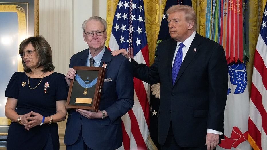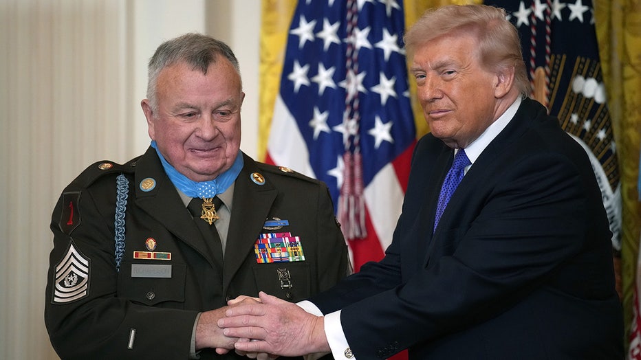 Ret. Command Sgt. Mgr. Terry P. Richardson (L) is presented the Medal of Honor by U.S. President Donald Trump during a Medal of Honor Ceremony in the East Room of the White House on March 02, 2026.