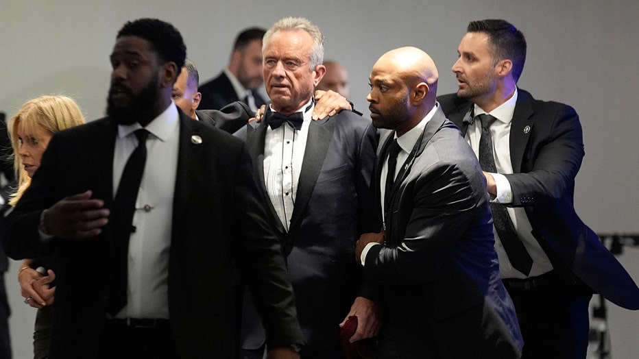 Law enforcement officers surround Robert F. Kennedy Jr., US secretary of Health and Human Services (HHS), and his wife, actress Cheryl Hines following reports of a shooting during the White House Correspondents' Association (WHCA) dinner in Washingto