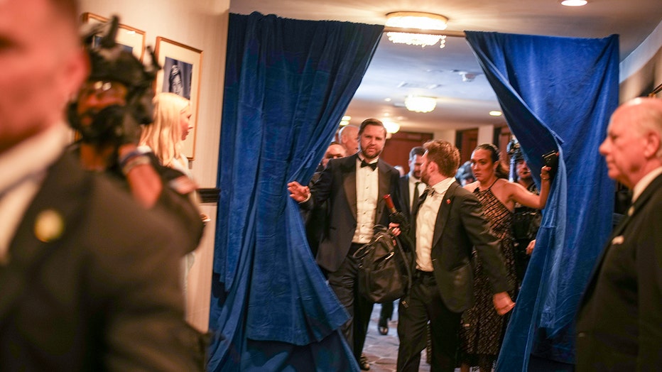 WASHINGTON, DC - APRIL 25: U.S. Vice President JD Vance is escorted after an incident at the annual White House Correspondents Association Dinner April 25, 2026 in Washington, DC. According to reports, President Donald Trump, along with other governm