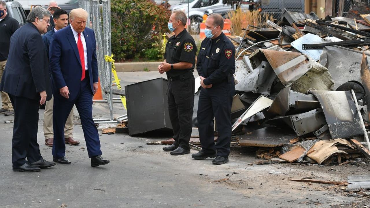 President Donald Trump with U.S. Attorney General William Barr (L) tours an area affected by civil unrest in Kenosha, Wisconsin on Sept. 1, 2020. (Photo by MANDEL NGAN/AFP via Getty Images)