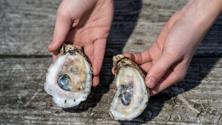 Brycen Strzegowski holds an opened and shucked oyster on the pier behind his familyâs home. Due to many factors, obtaining oysters has been difficult for businesses and oyster shuckers. (Surya Vaidy/Baltimore Sun/Tribune News Service via Getty Images