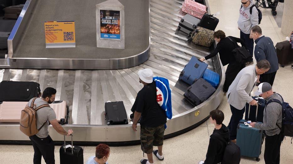Passengers retrieve luggage from a baggage carousel after arriving at Midway Airport on a Southwest Airlines flight on May 27, 2025 in Chicago, Illinois. (Photo by Scott Olson/Getty Images)