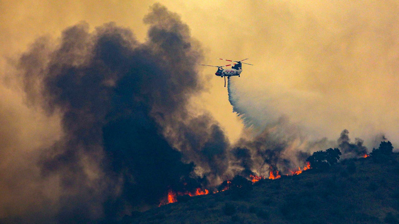 A chinook helicopter makes a water drop on Blue Ridge fire on Oct. 27, 2020 in Chino Hills, California. (Photo by Irfan Khan/Los Angeles Times via Getty Images)