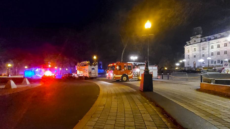 FILE - Firefighter trucks are parked in front of the National Assembly of Quebec, in Quebec City, early on November 1, 2020, after two people were killed and five wounded by a sword-wielding suspect dressed in medieval clothing. (JORDAN PROUST/AFP via Getty Images)