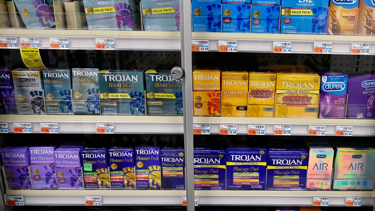 Packs of various condoms stand on a shelf of a CVS store in Washington, DC, on February 23, 2022. (Photo by OLIVIER DOULIERY/AFP via Getty Images)