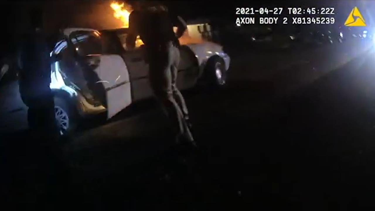 Police responded to the scene of a crash shortly before midnight. Body camera footage shows several officers sprinting towards the burning 1998 Lincoln Town Car.