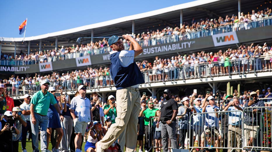 SCOTTSDALE, AZ - FEBRUARY 4: Travis Kelce of the Kansas City Chiefs hits his tee shot on the 16th hole prior to the WM Phoenix Open 2026 at TPC Scottsdale on February 4, 2026 in Scottsdale, Arizona. (Photo by Justin Edmonds/Getty Images)