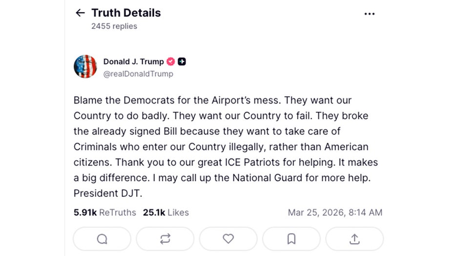Trump on Wednesday once again blamed Democrats for the "mess" at airports across the country, adding he would call upon the National Guard to join ICE agents to assist the TSA, according to the president’s Truth Social account.