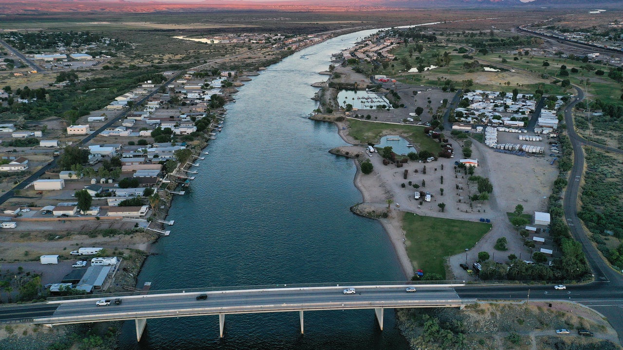 NEEDLES, CALIFORNIA - MAY 26: An aerial view of vehicles crossing over a bridge spanning the Colorado River, the border between Needles, California (R) and Mohave Valley, Arizona (L), amid the coronavirus COVID-19 pandemic on May 26, 2020 in Needles,
