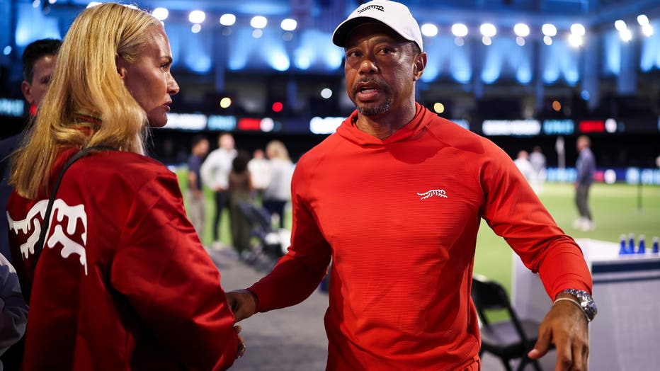 PALM BEACH GARDENS, FLORIDA - MARCH 17: Tiger Woods of Jupiter Links GC talks with his girlfriend, Vanessa Trump, after a match against Boston Common Golf at SoFi Center on March 17, 2026 in Palm Beach Gardens, Florida. (Photo by James Gilbert/TGL/TG