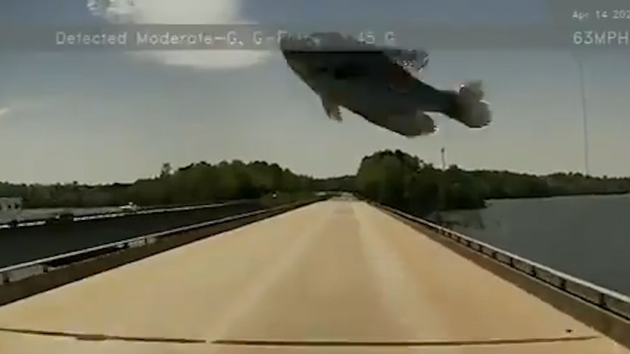 Dashcam video shows a bird dropping its fish snack right onto the windshield of a driver in North Carolina.
