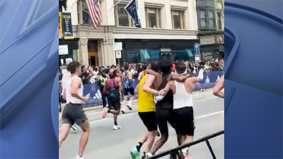 Heartwarming video showed runners at the Boston Marathon helping a fellow runner cross the finish line after he collapsed from exhaustion.