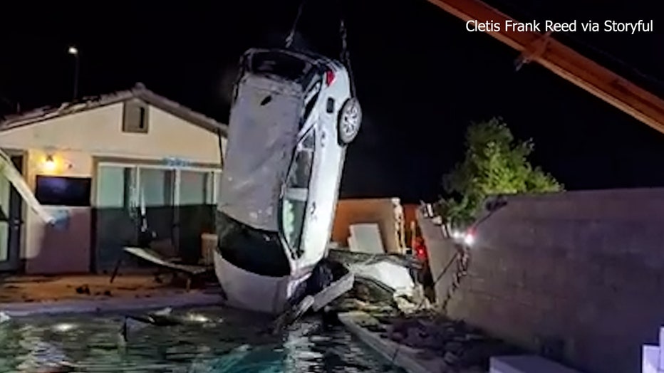 Homeowner Cletis Reed told FOX 5 he heard a loud crash that sounded "like a freight train" and rushed outside, only to find his backyard destroyed and a woman floating in his pool.