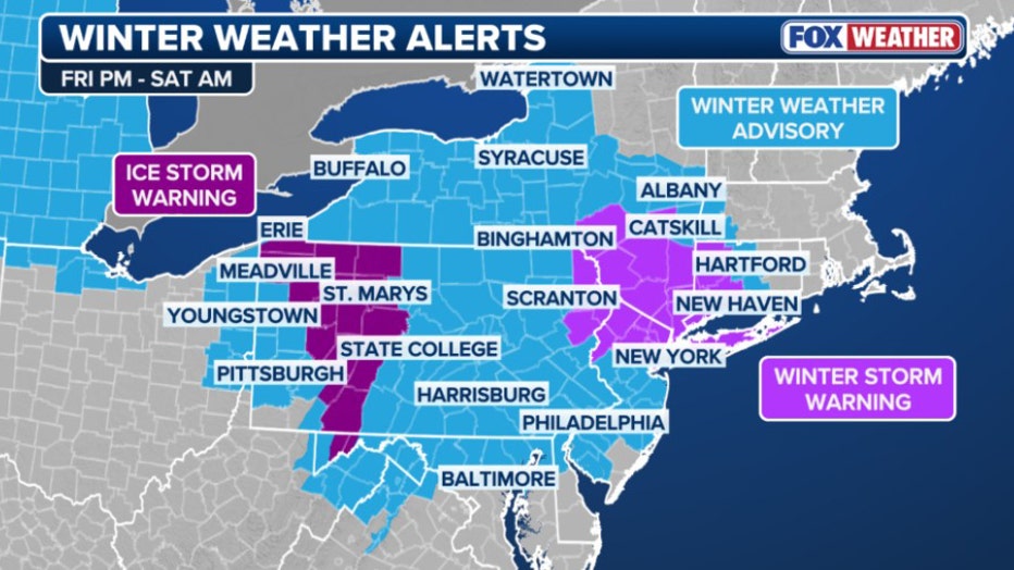 This graphic displays winter weather alerts in place in the Northeast from Friday through Saturday. (FOX Weather)