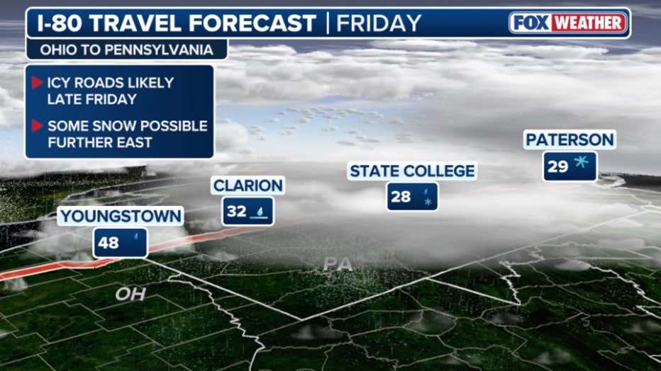 This graphic displays a travel forecast for I-80 from Ohio to Pennsylvania. (FOX Weather)