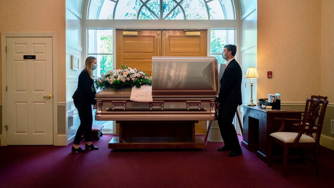 Funeral Home Director Chris Fontana (R) and apprentice Christina Smith (L) position Mrs. Barbara Lipscomb's coffin in front of the door, as they prepare a drive-thru viewing at the Fellows, Helfenbein & Newnam Funeral Home in Centreville, Marylan