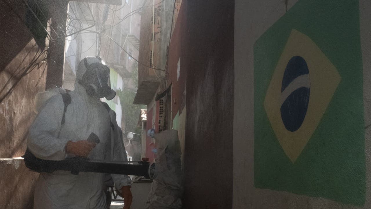 A municipal worker carries out disinfection works at Favela Dona Marta as a to stem the spread of coronavirus (COVID-19) in Rio de Janeiro, Brazil, on March 20, 2021. (Photo by Fabio Teixeira/Anadolu Agency via Getty Images)