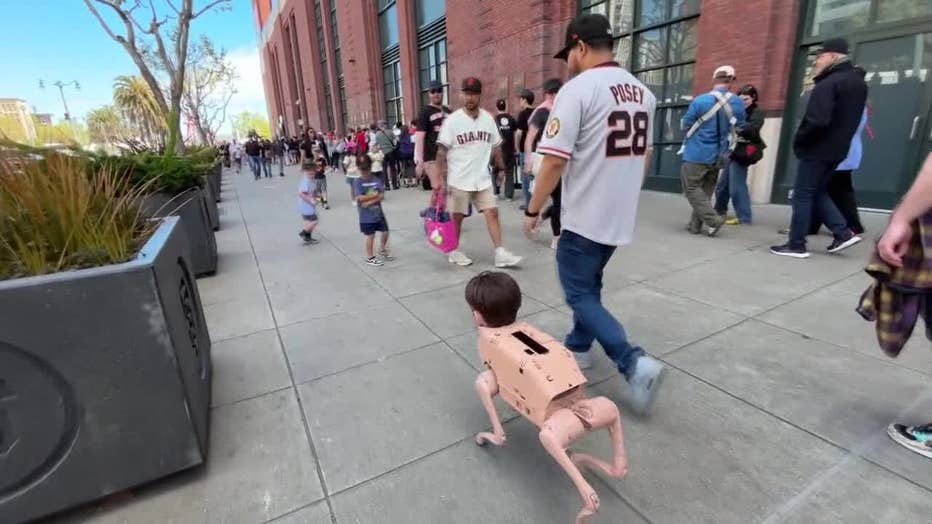 Autonomous Elon Musk head walks around San Francisco outside Giants game. April 8, 2026