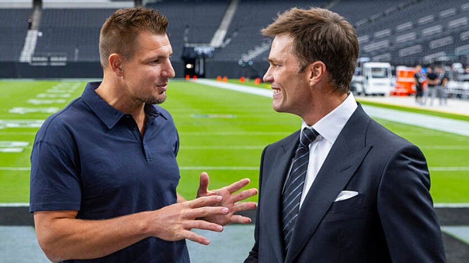 FILE-Rob Gronkowski and Tom Brady come together as they join Fanatics, FOX Sports and OBB Media to announce their inaugural flag football event at Allegiant Stadium on Monday, Sept. 15, 2025, in Las Vegas. (L.E. Baskow/Las Vegas Review-Journal) @Left