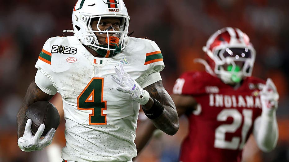 MIAMI GARDENS, FLORIDA - JANUARY 19: Mark Fletcher Jr. #4 of the Miami Hurricanes runs for a third quarter touchdown against the Indiana Hoosiers in the 2026 College Football Playoff National Championship at Hard Rock Stadium on January 19, 2026 in M