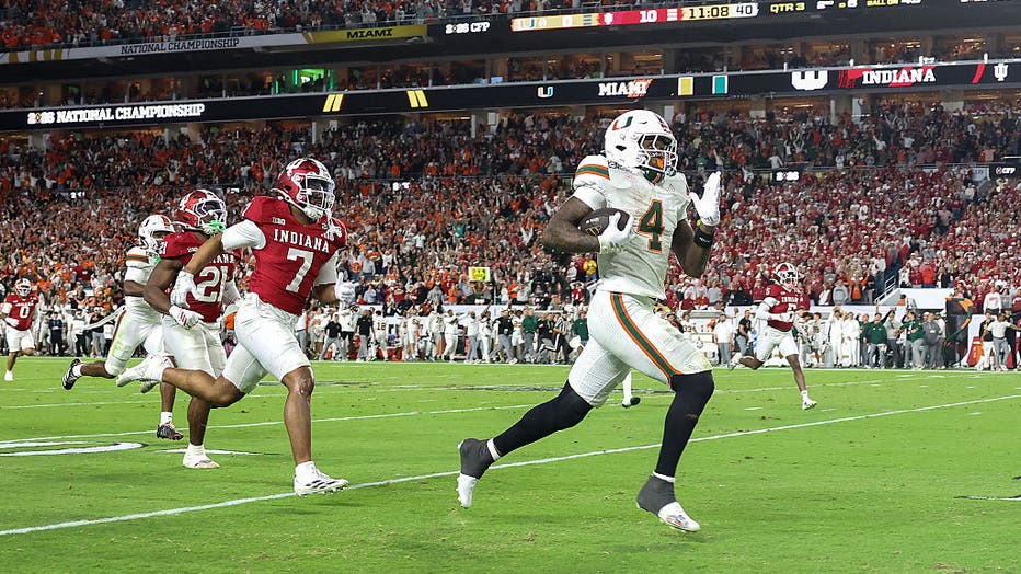 MIAMI GARDENS, FLORIDA - JANUARY 19: Mark Fletcher Jr. #4 of the Miami Hurricanes runs for touchdown against the Indiana Hoosiers during the third quarter in the 2026 College Football Playoff National Championship at Hard Rock Stadium on January 19,