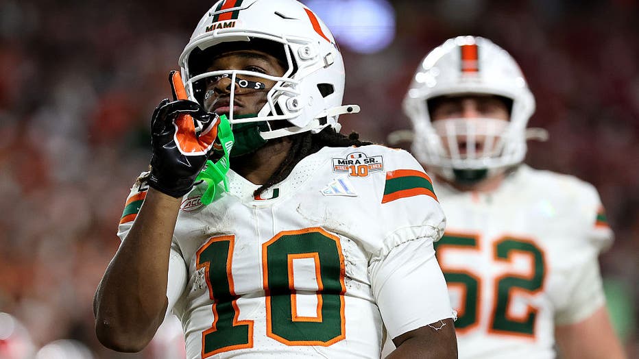 MIAMI GARDENS, FLORIDA - JANUARY 19: Malachi Toney #10 of the Miami Hurricanes celebrates a fourth quarter touchdown against the Indiana Hoosiers in the 2026 College Football Playoff National Championship at Hard Rock Stadium on January 19, 2026 in M