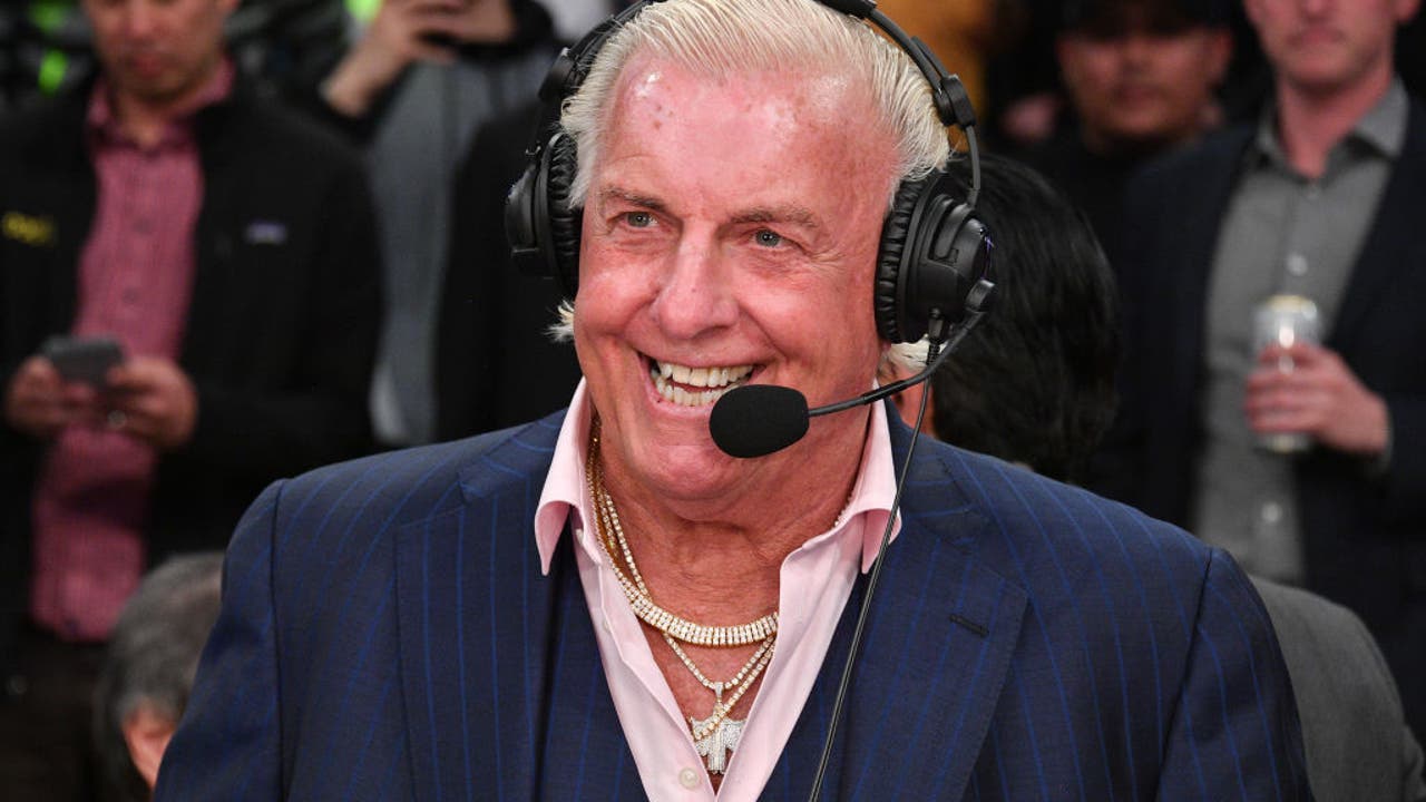 LOS ANGELES, CALIFORNIA - FEBRUARY 25: Ric Flair joins a telecast during a basketball game between the Los Angeles Lakers and the New Orleans Pelicans at Staples Center on February 25, 2020 in Los Angeles, California. (Photo by Allen Berezovsky/Getty