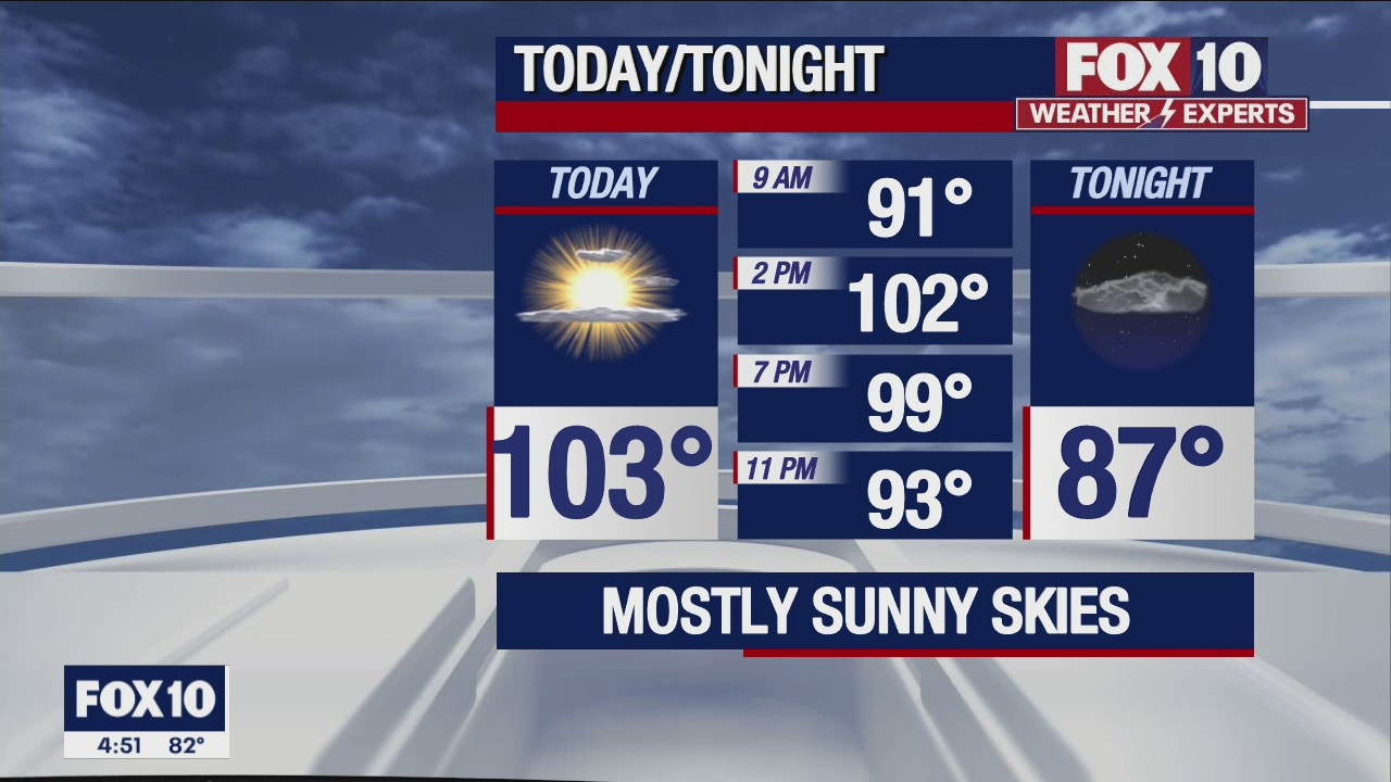 Mostly sunny skies and a chance for storms in the Valley with a high in the low-100s.