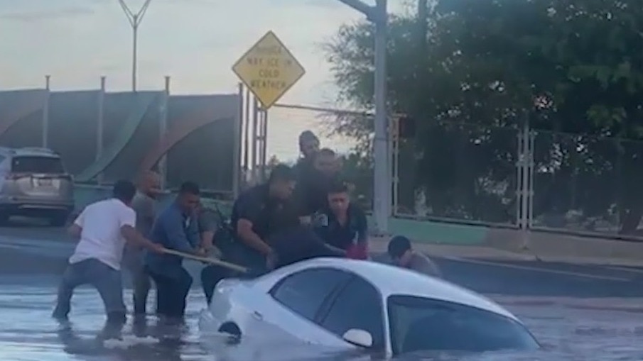 A group of firefighters in El Paso, Texas saved a woman from a car stuck in a sinkhole.