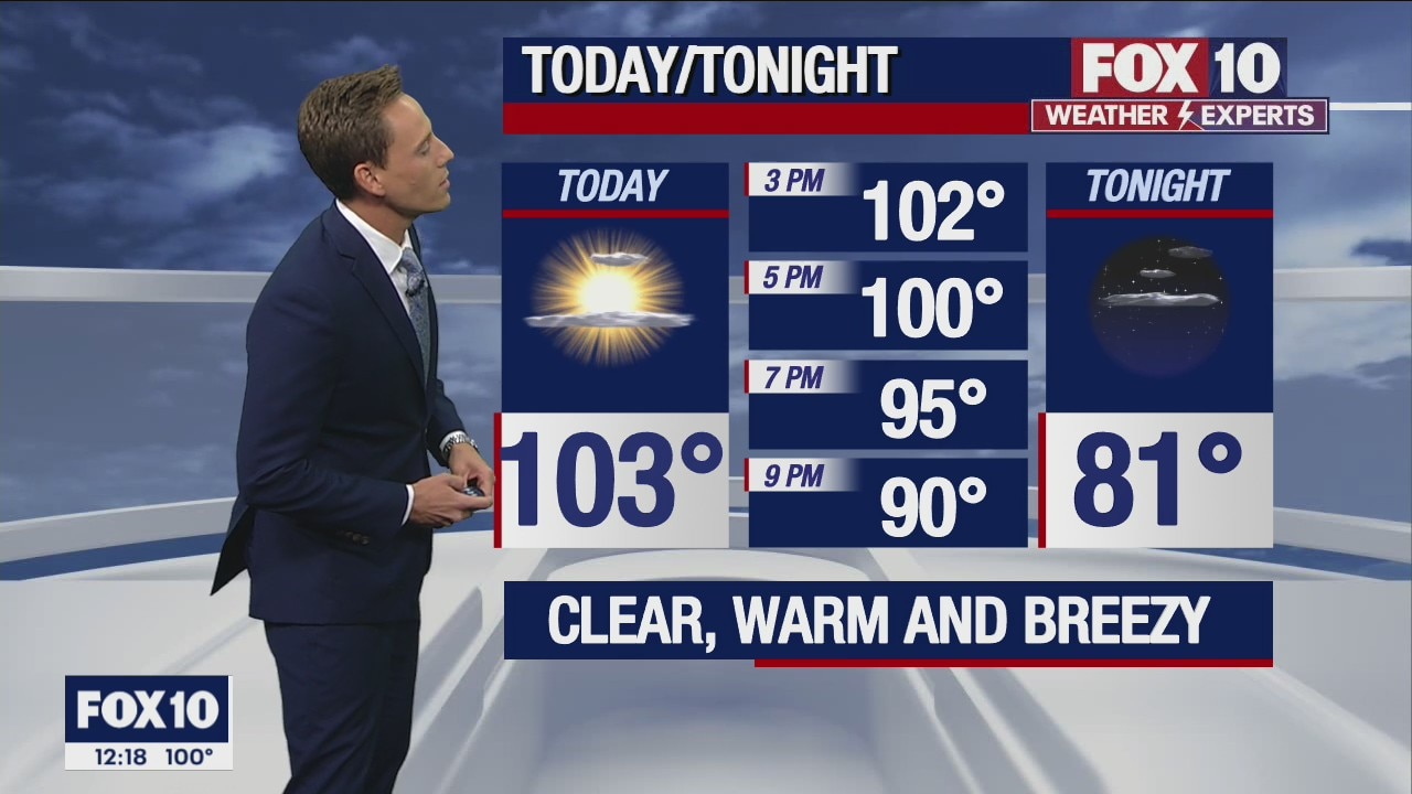 Clear, warm and breezy in the Valley with a high in the low-100s.