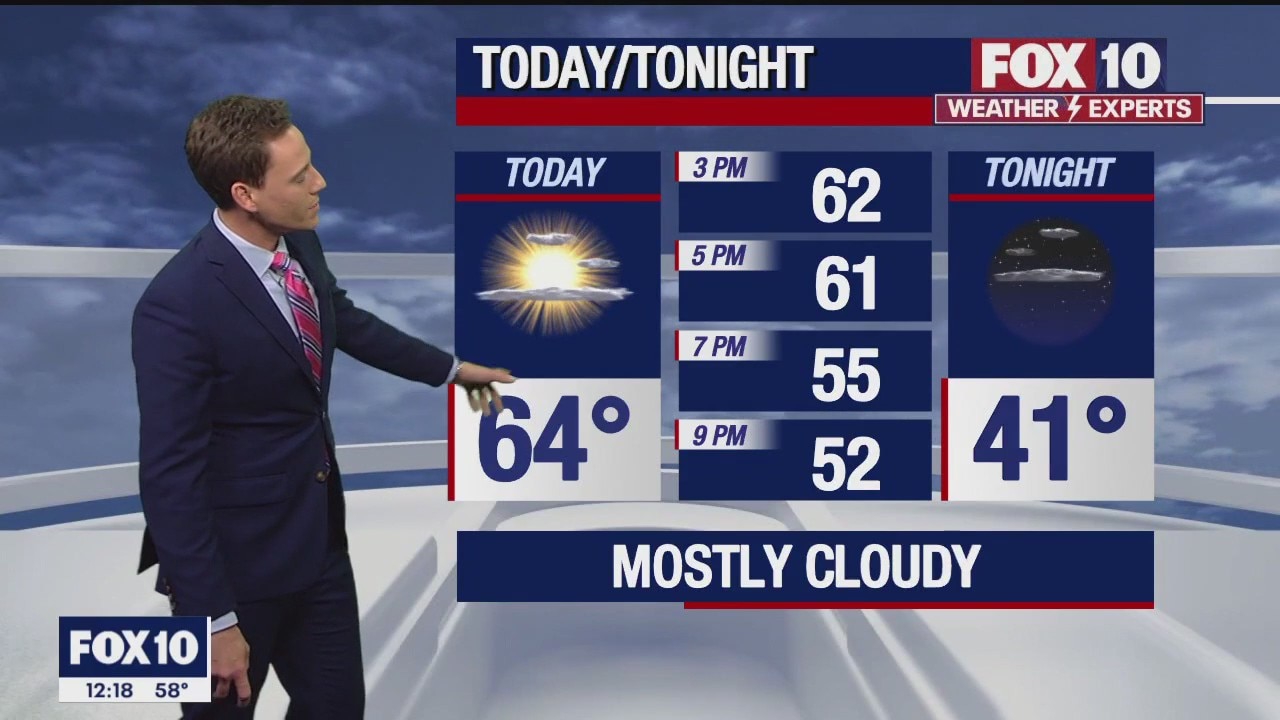 Mostly cloudy skies in the Valley with a high near the mid-60s.