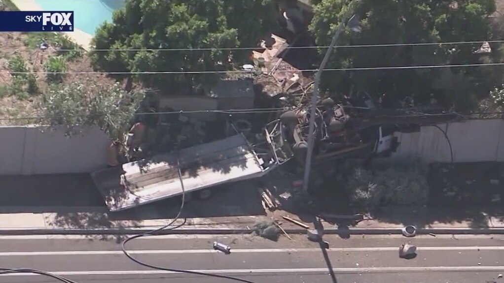 A vehicle crashed into a wall in a Mesa neighborhood on Wednesday, knocking down power lines and igniting a small fire.